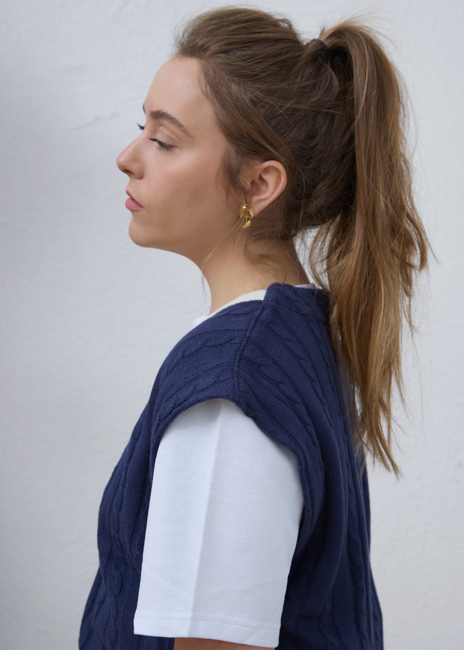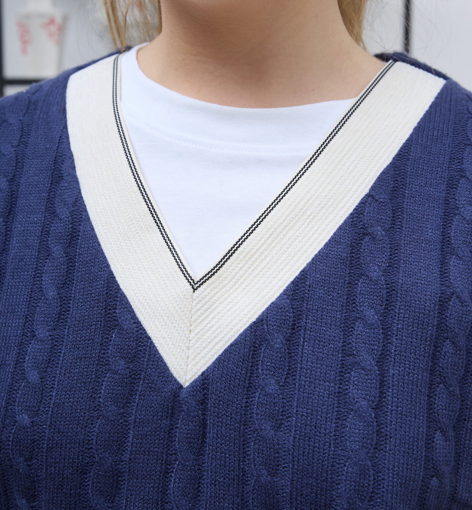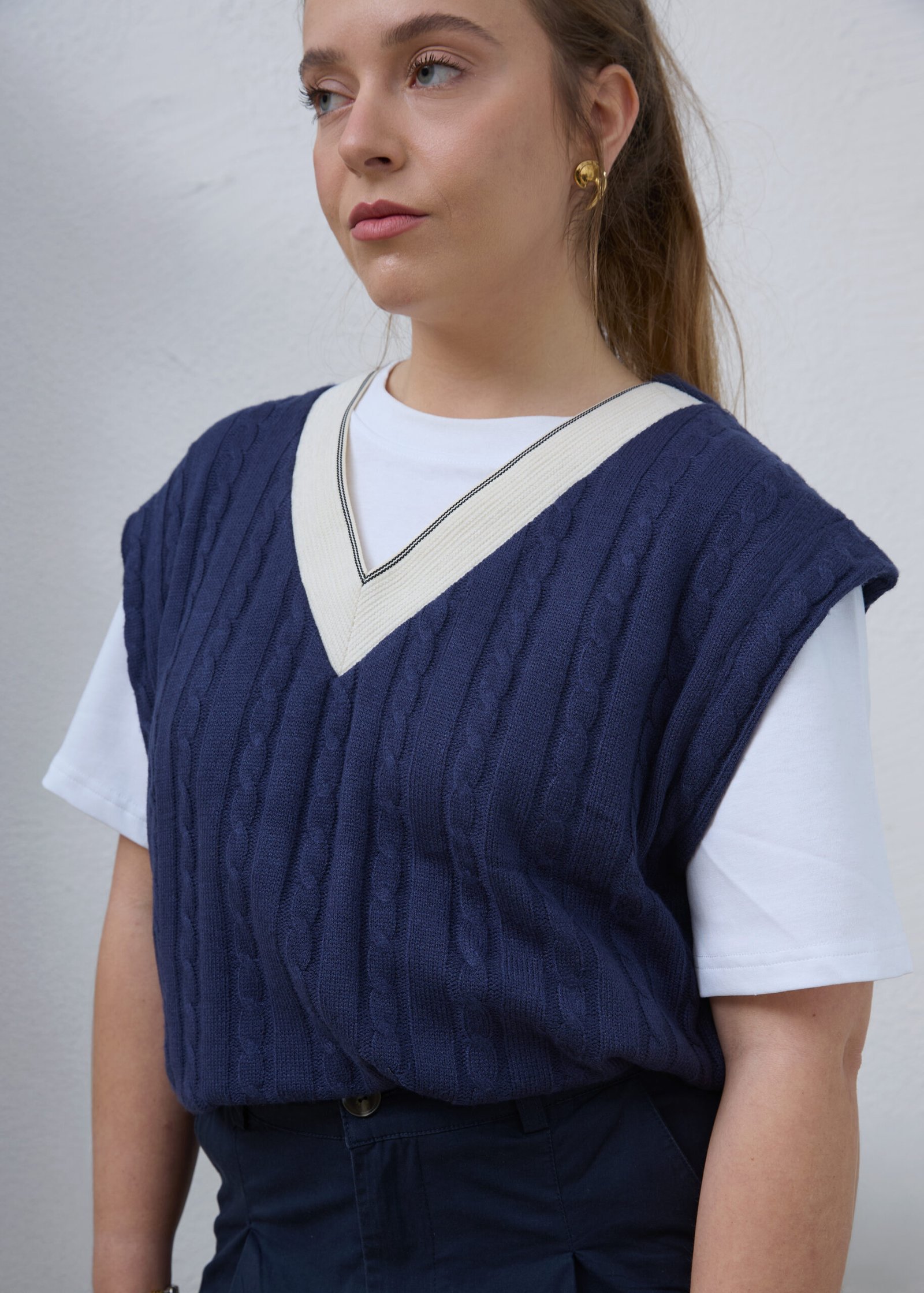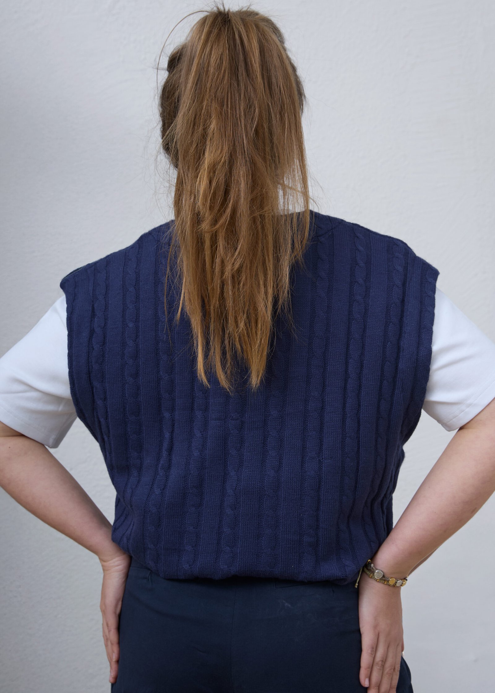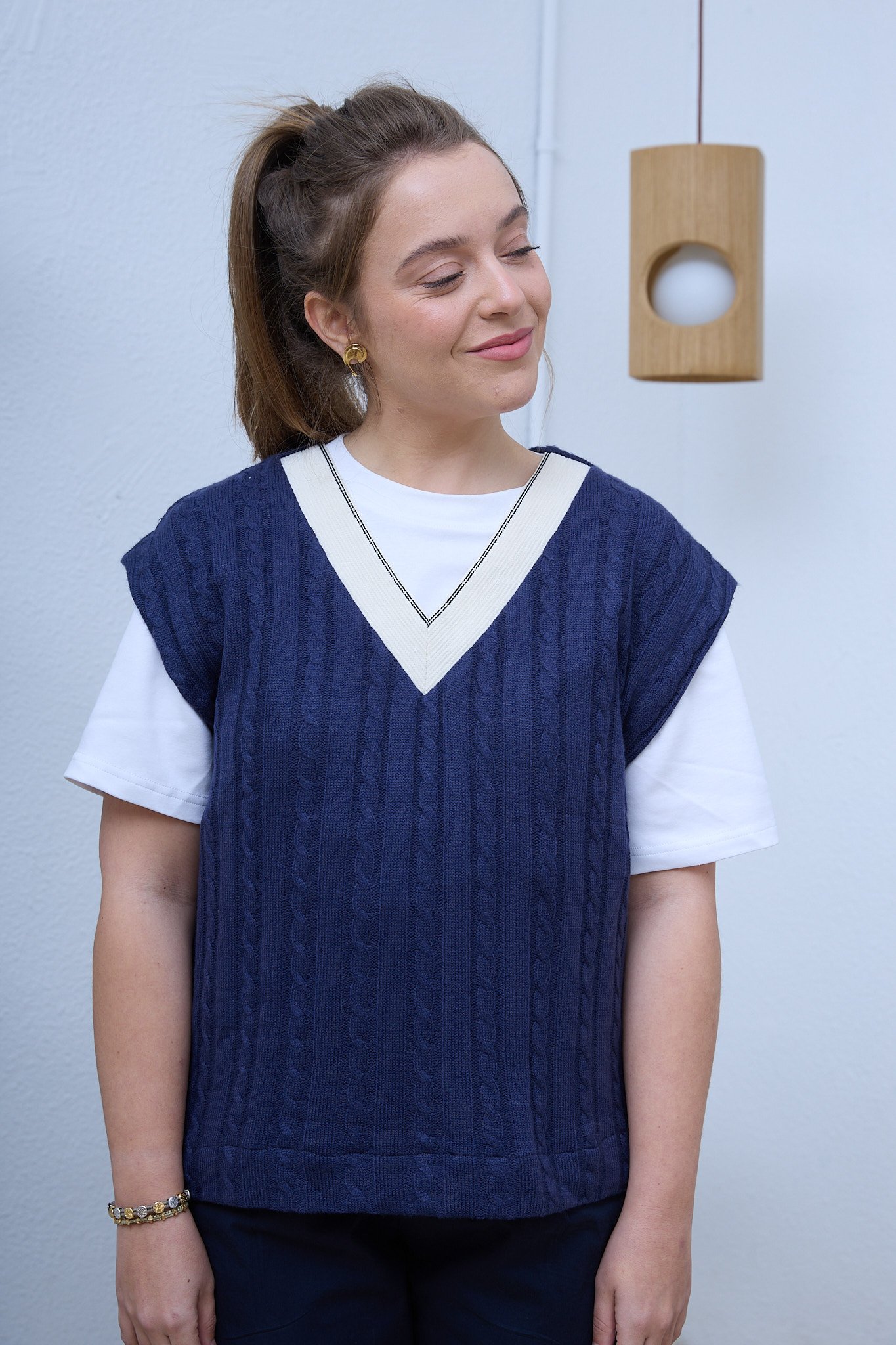 אפודת סריג עם טקסטורה, מפתח וי צר ועמוק, דקה ונעימה, רקמת לוגו בגב החולצה בצבע אדום, משאירה מרווח בין הגוף לבגד.