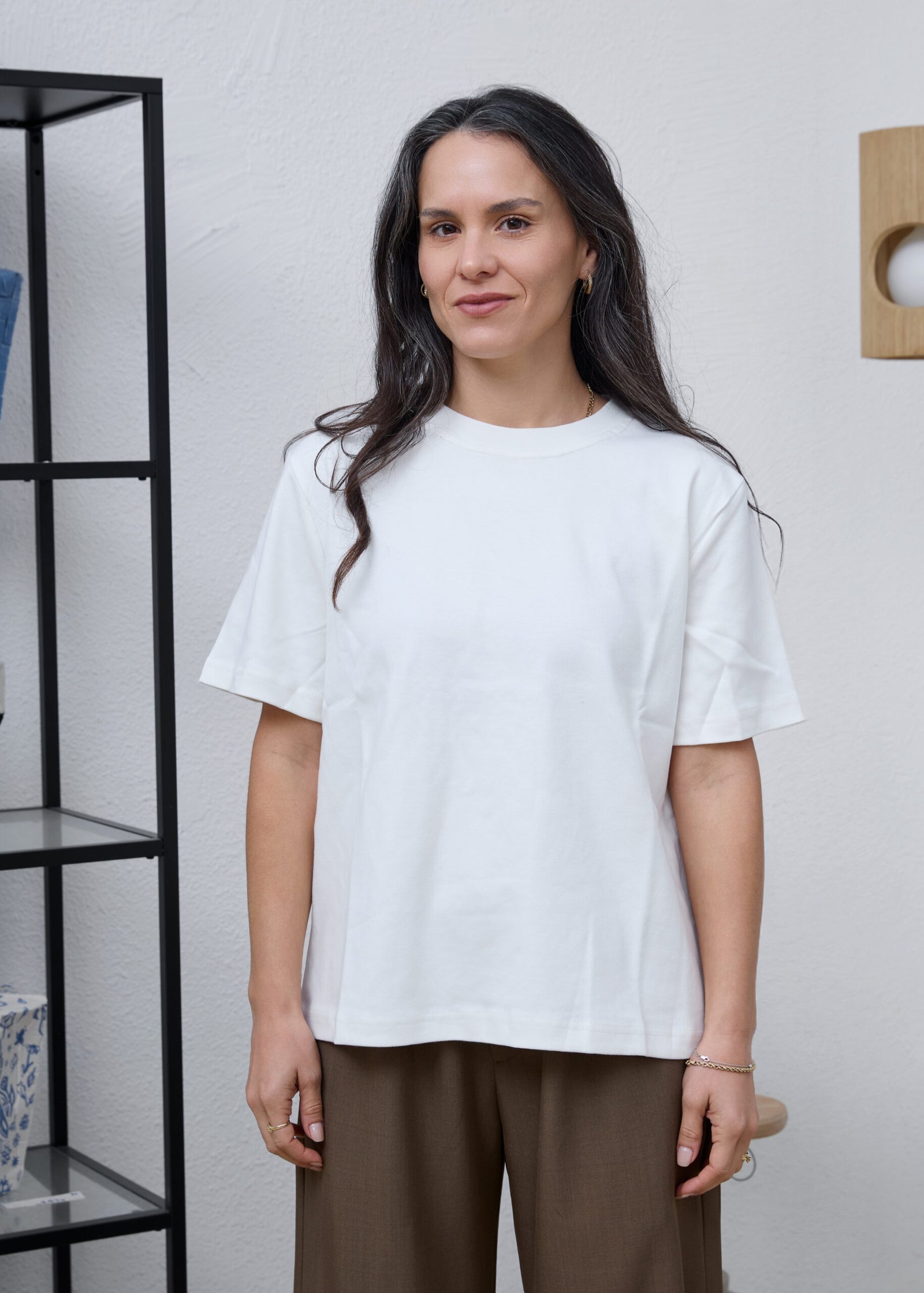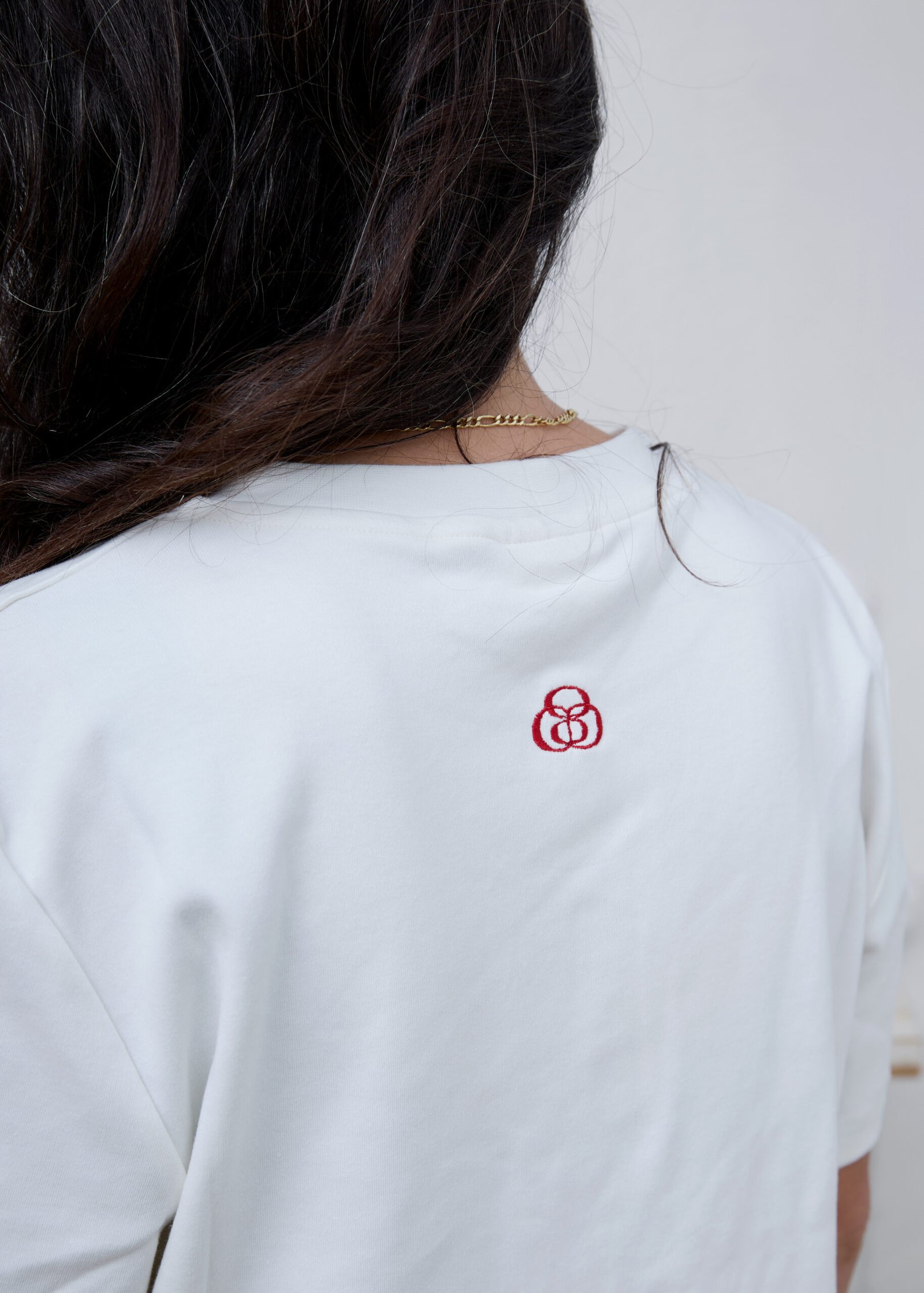 חולצת T בעובי סטנדרטי, צבע לבן, אייקון מותג רקום בצוואר בצבע אדום, משאירה מרווח בין הגוף לבגד.