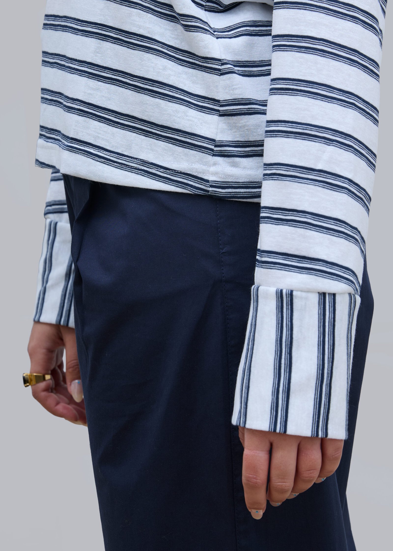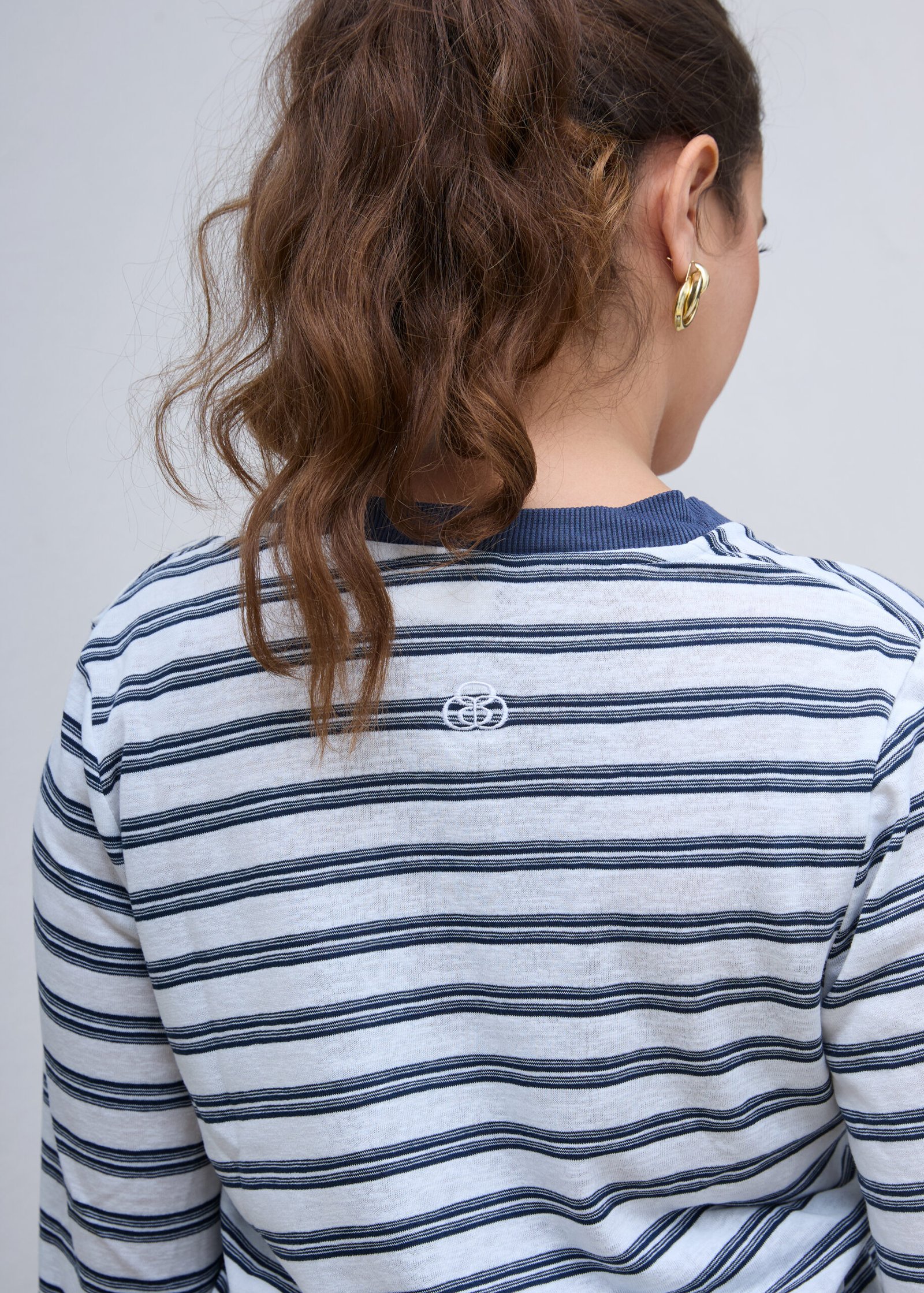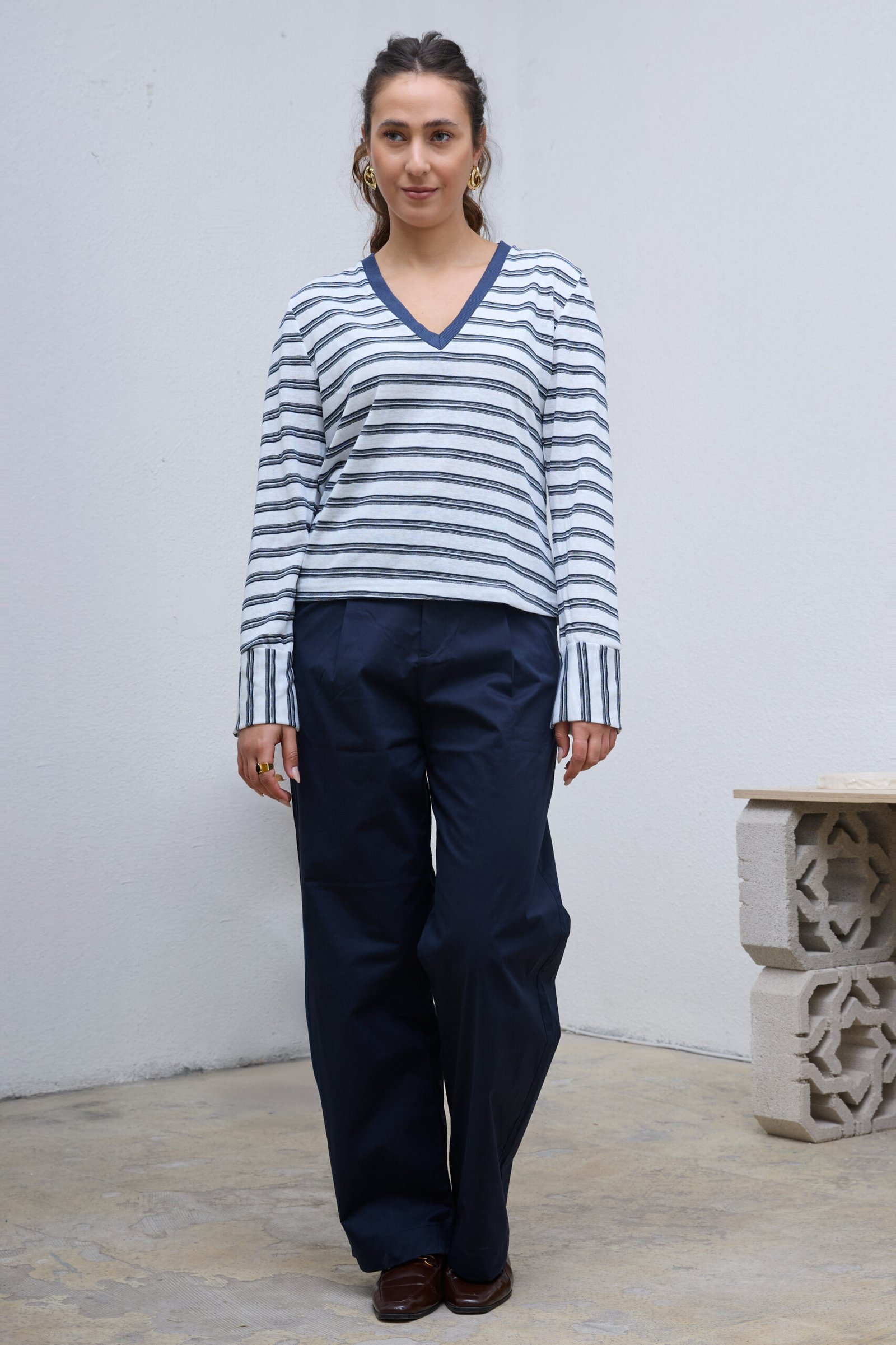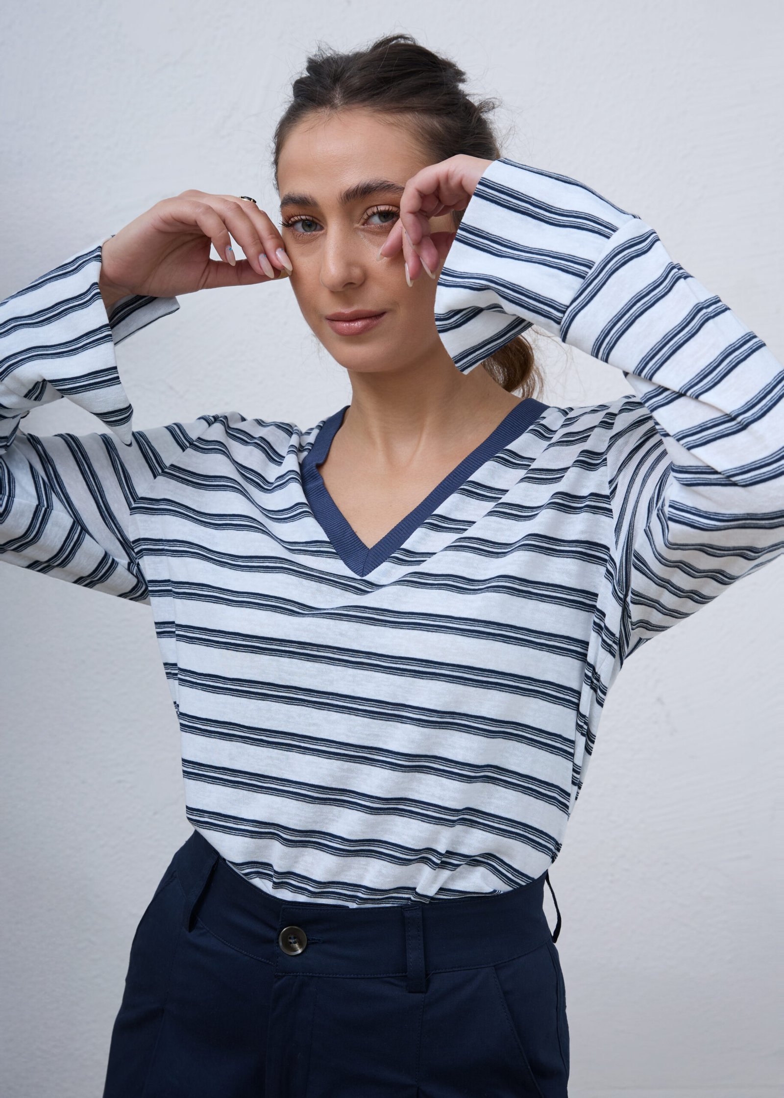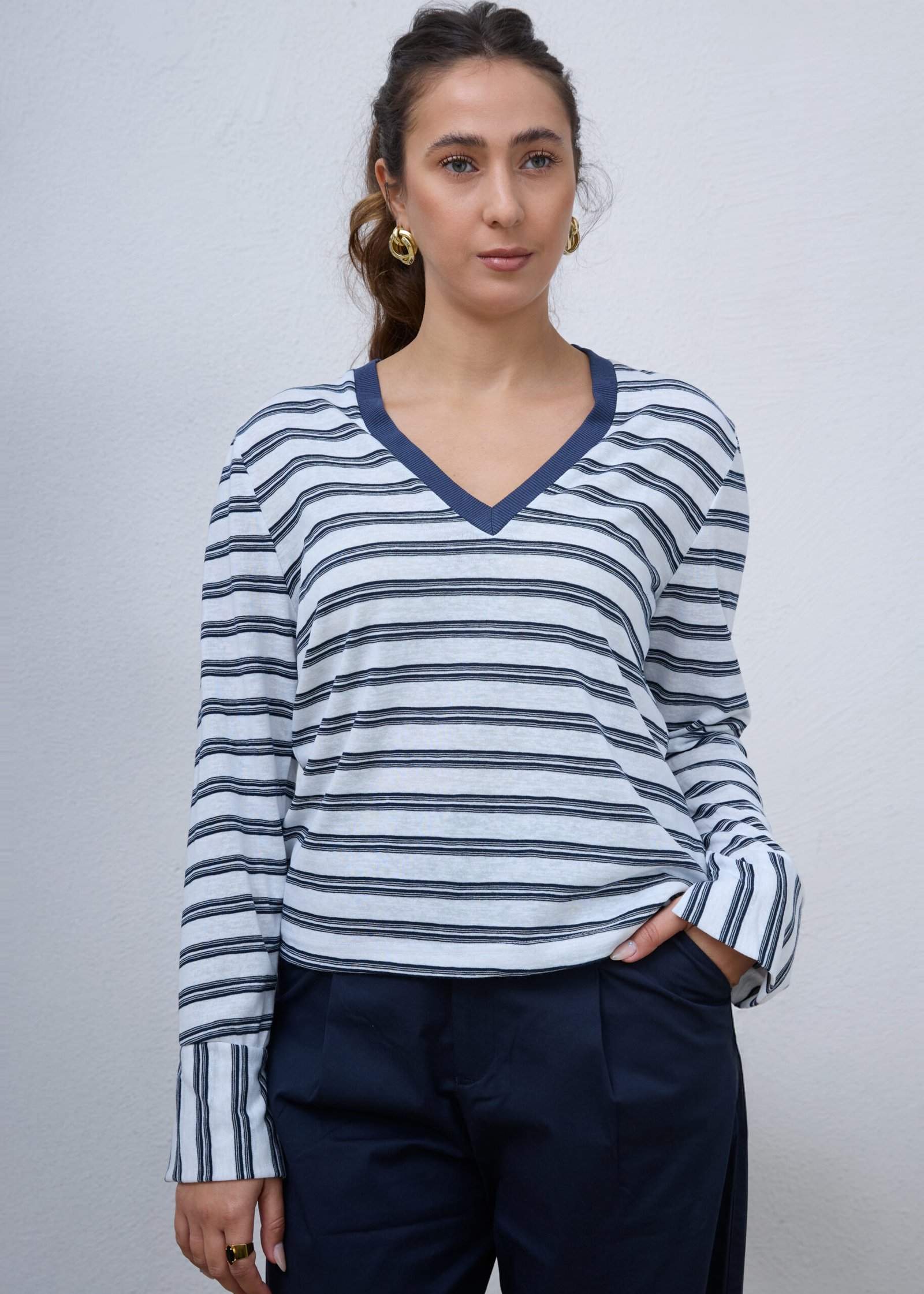 חולצת V ארוכה בהדפס פסים כחול ולבן, עם מפתח צר ועמוק, דקה ונעימה, בד מעט שקפקף, שרוולים נפתחים, רקמת לוגו בגב החולצה, משאירה מרווח בין הגוף לבגד.