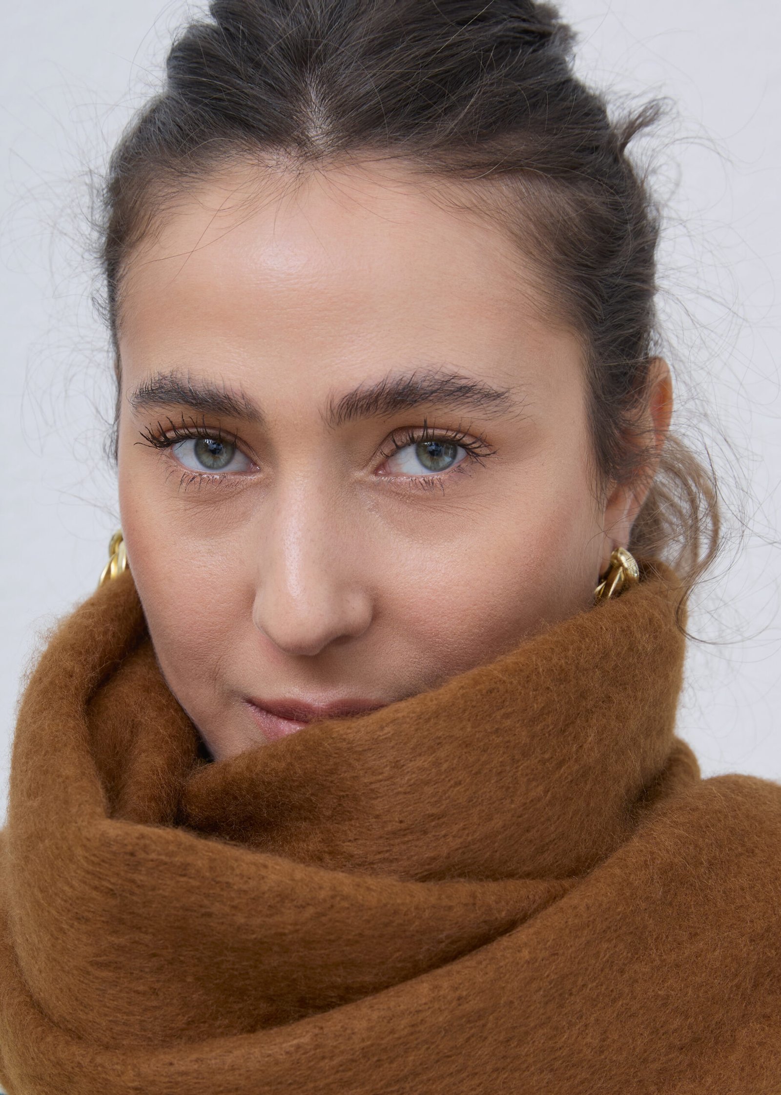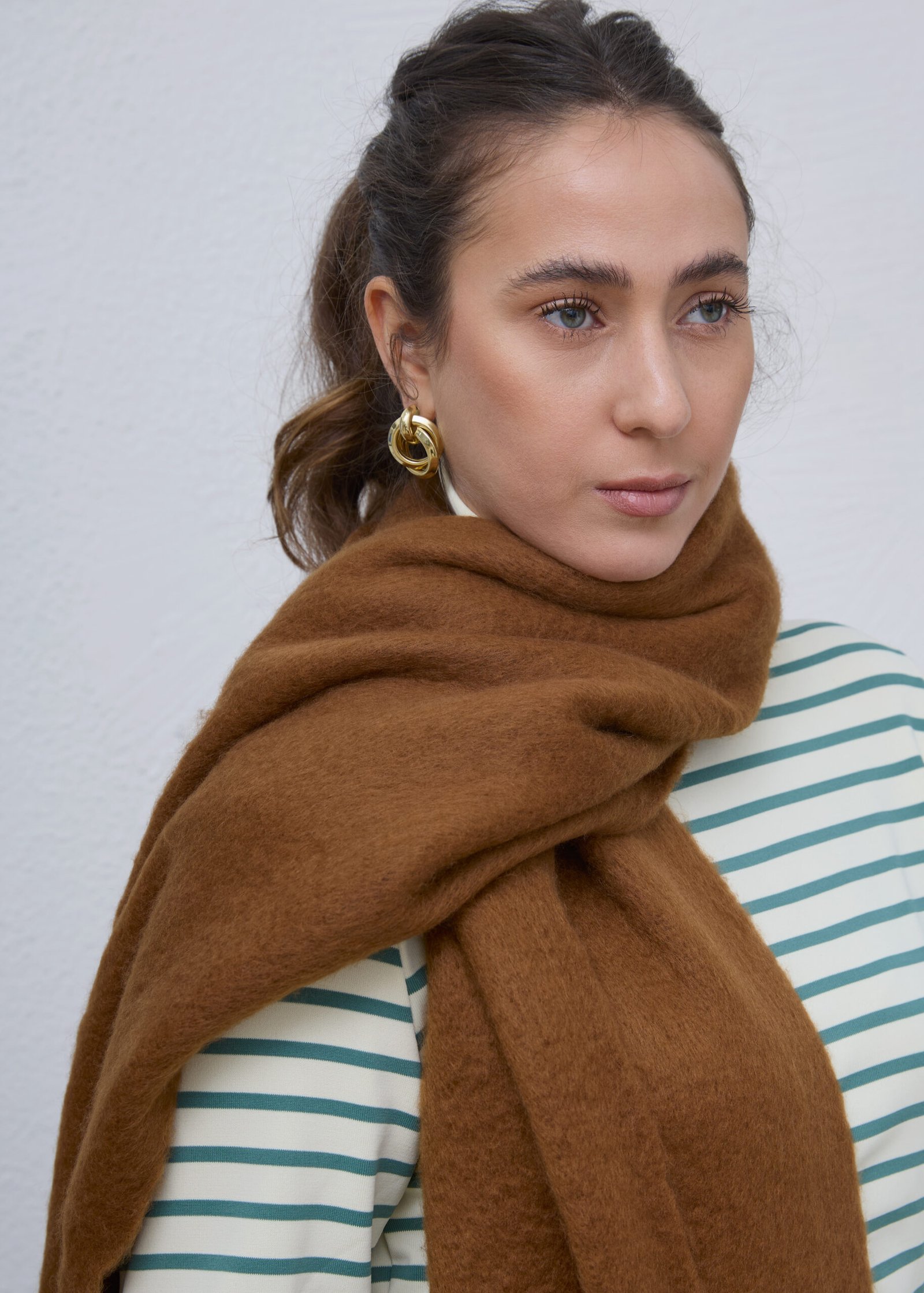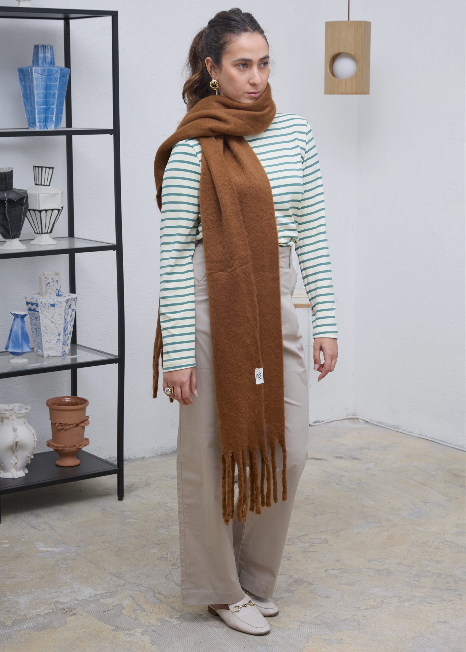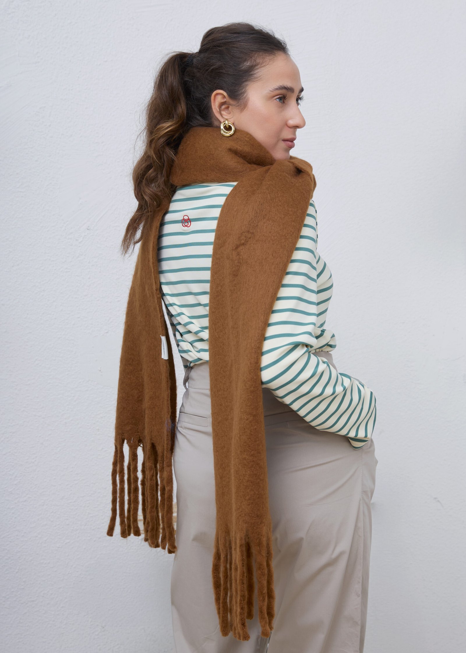 צעיף בגודל מדויק, נעים למגע, בצבע חום אדמה. עשוי מבד רך ומחמם, עם סיומת פרנזים.