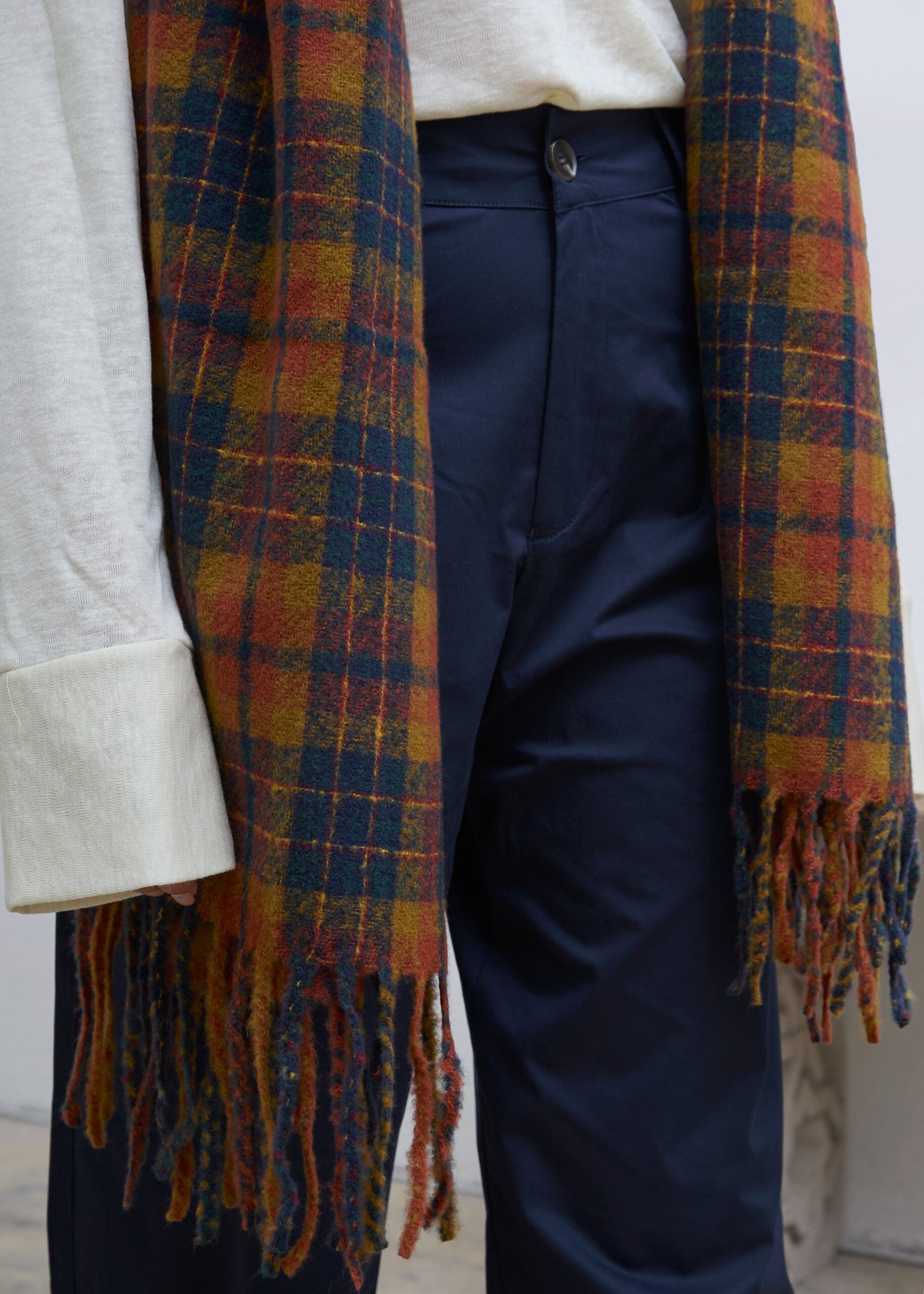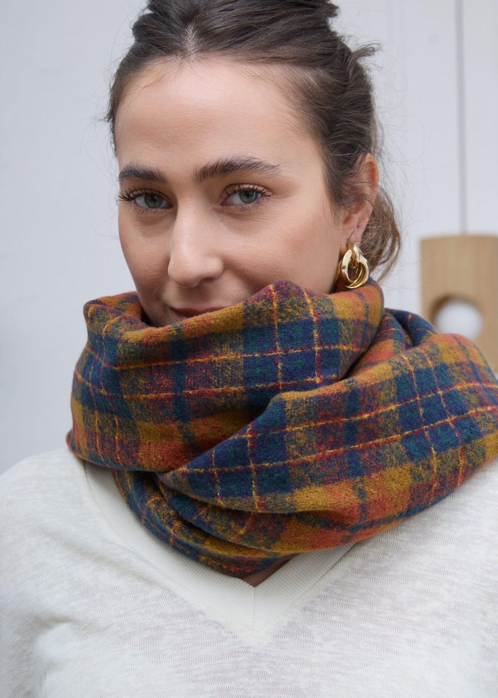 צעיף בגודל מדויק, נעים למגע, בעיצוב משבצות בגוונים חומים. עשוי מבד רך ומחמם, עם סיומת פרנזים.