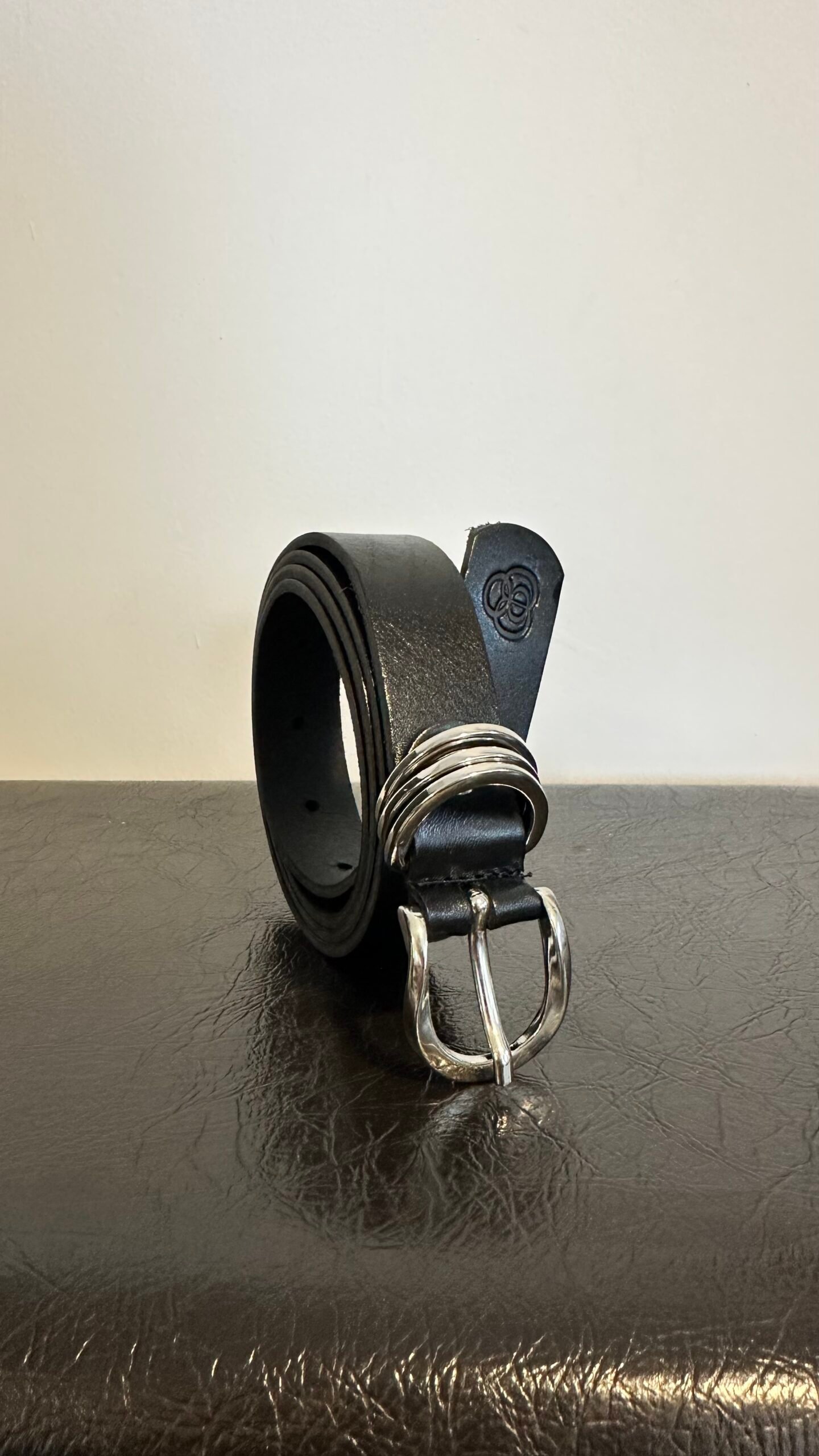 חגורת עור בצבע שחור, ברוחב 2.5 ס”מ, אבזם מעוגל משולב טבעות בגוון כסוף. עור אמיתי.