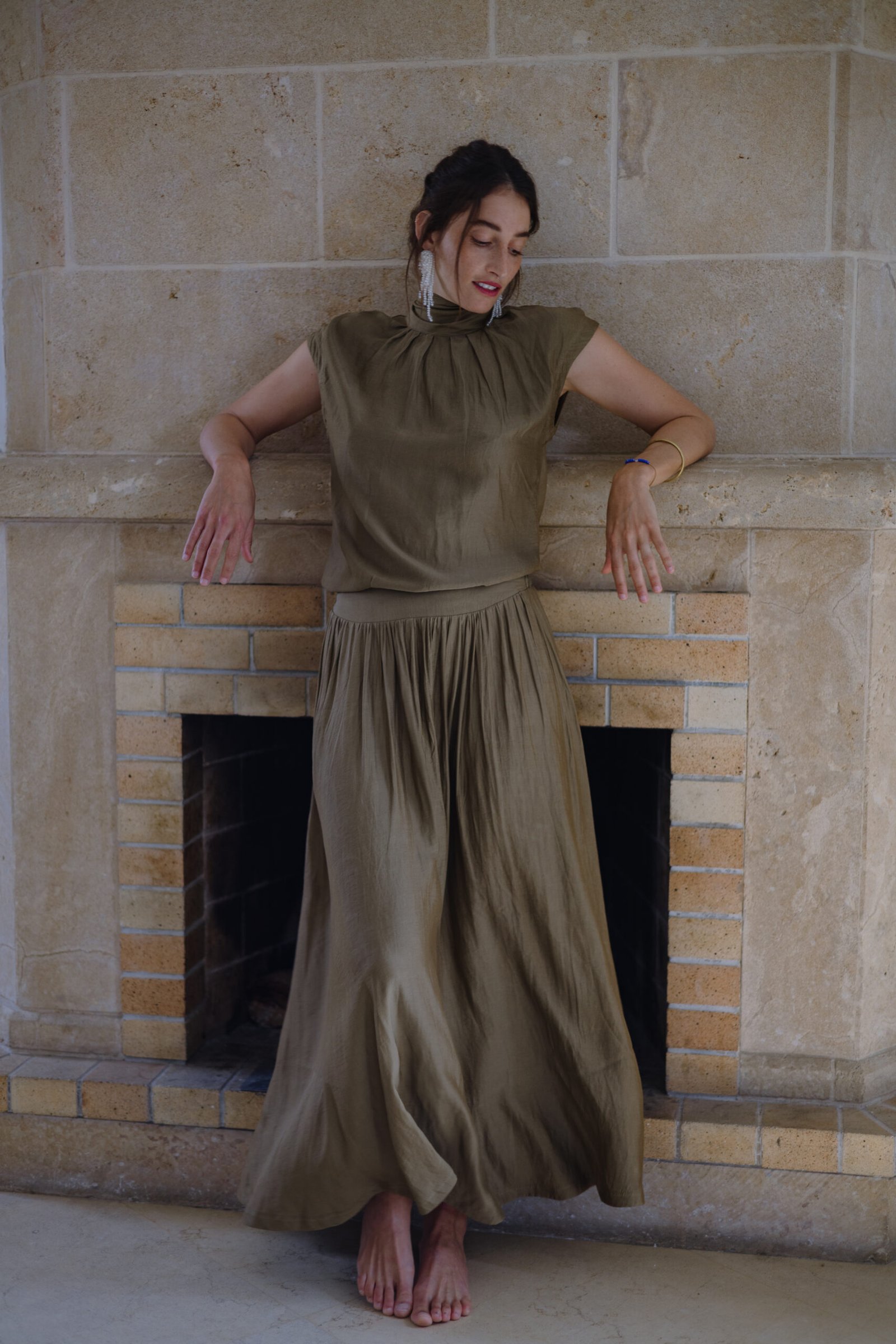 החלק התחתון: חצאית מקסי נשפכת עם כיווצים המעניקים נפח ותנועה. לחצאית גומי בחלק האחורי של המותן להתאמה מושלמת ונוחות מקסימלית.