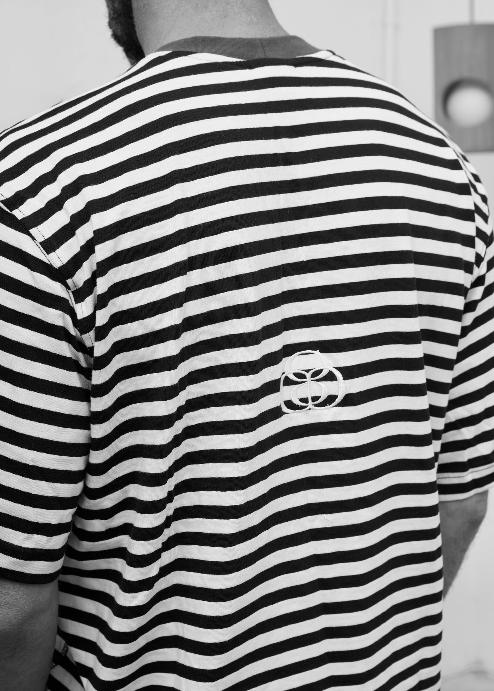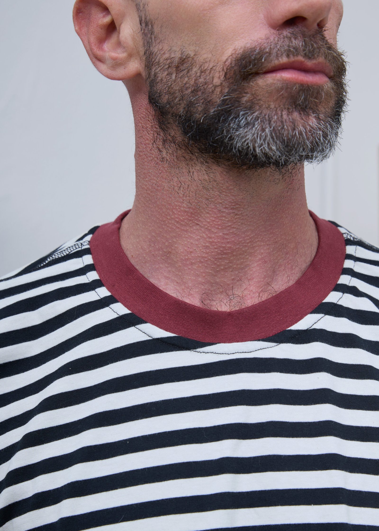חולצת T נעימה ורכה, הדפס פסים שמנת ושחור עם צווארון בורדו, משאירה מרווח בין הגוף לבגד.