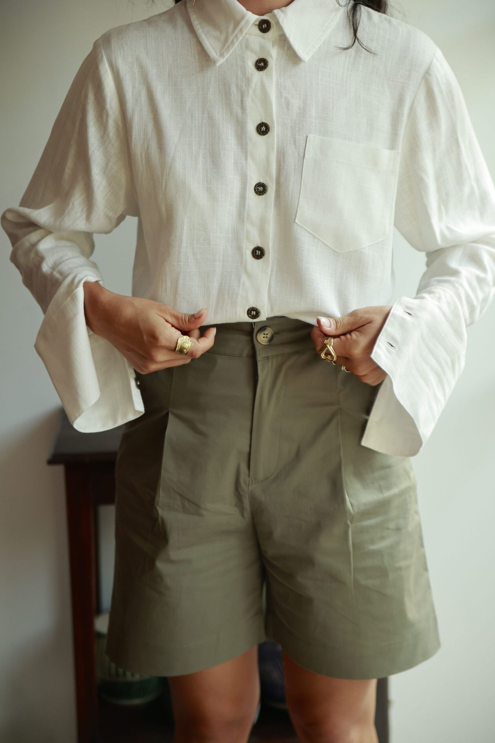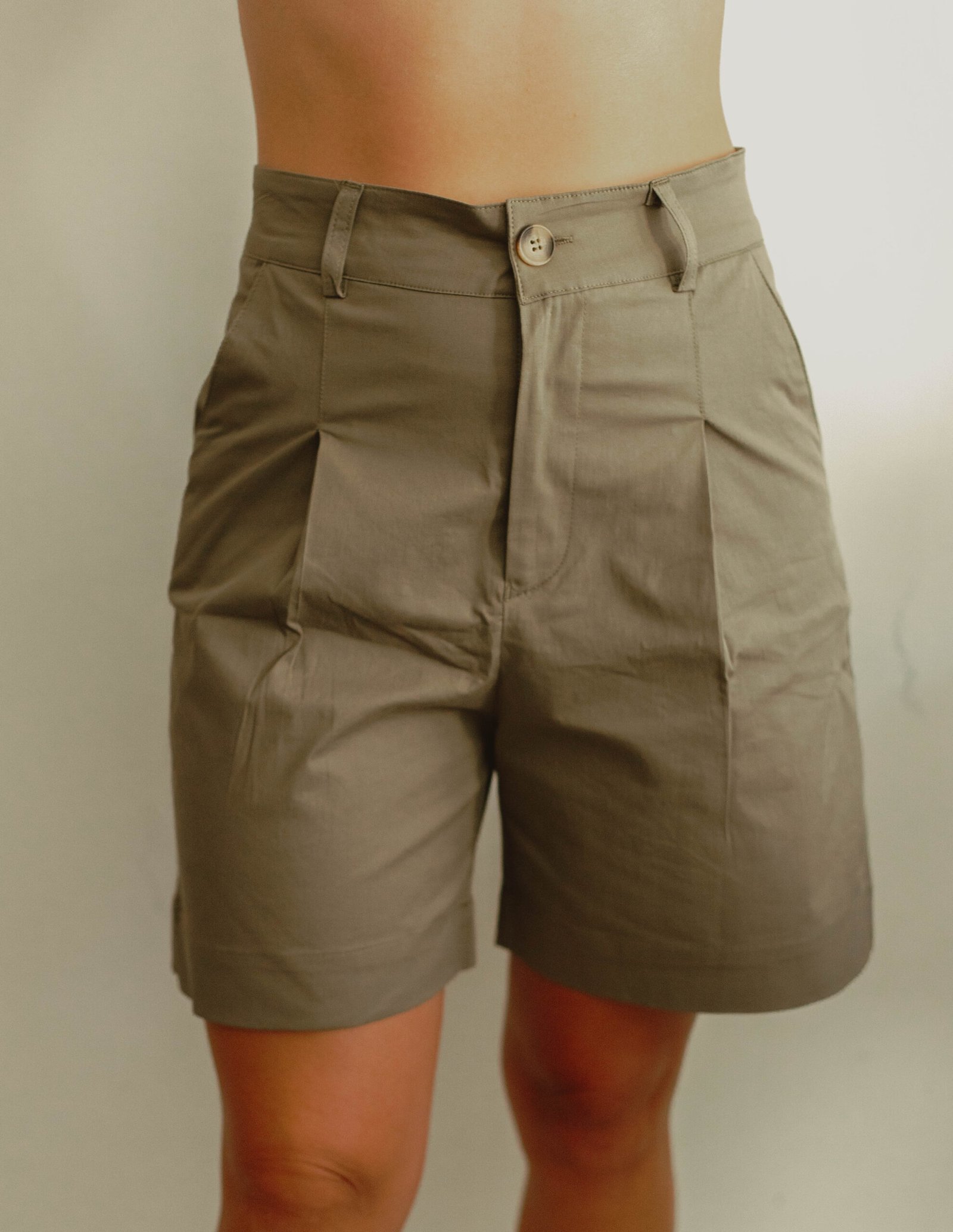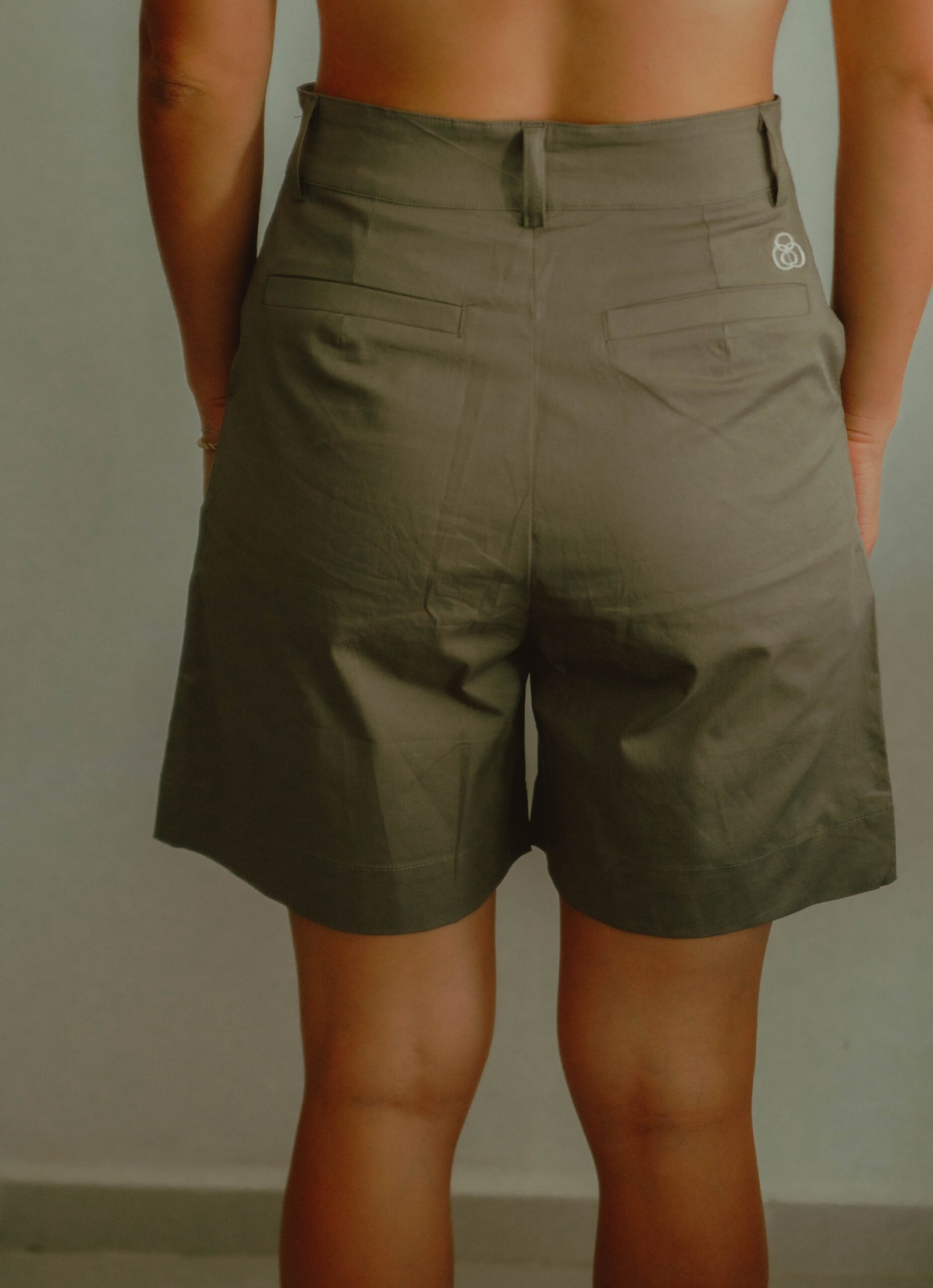 מכנסי ברמודה במראה מחויט עם קפלים, גובה המותניים גבוה, אורך מכנסיים מעל הברך, כיסים קדמיים ודמויי כיסים בחלק האחורי