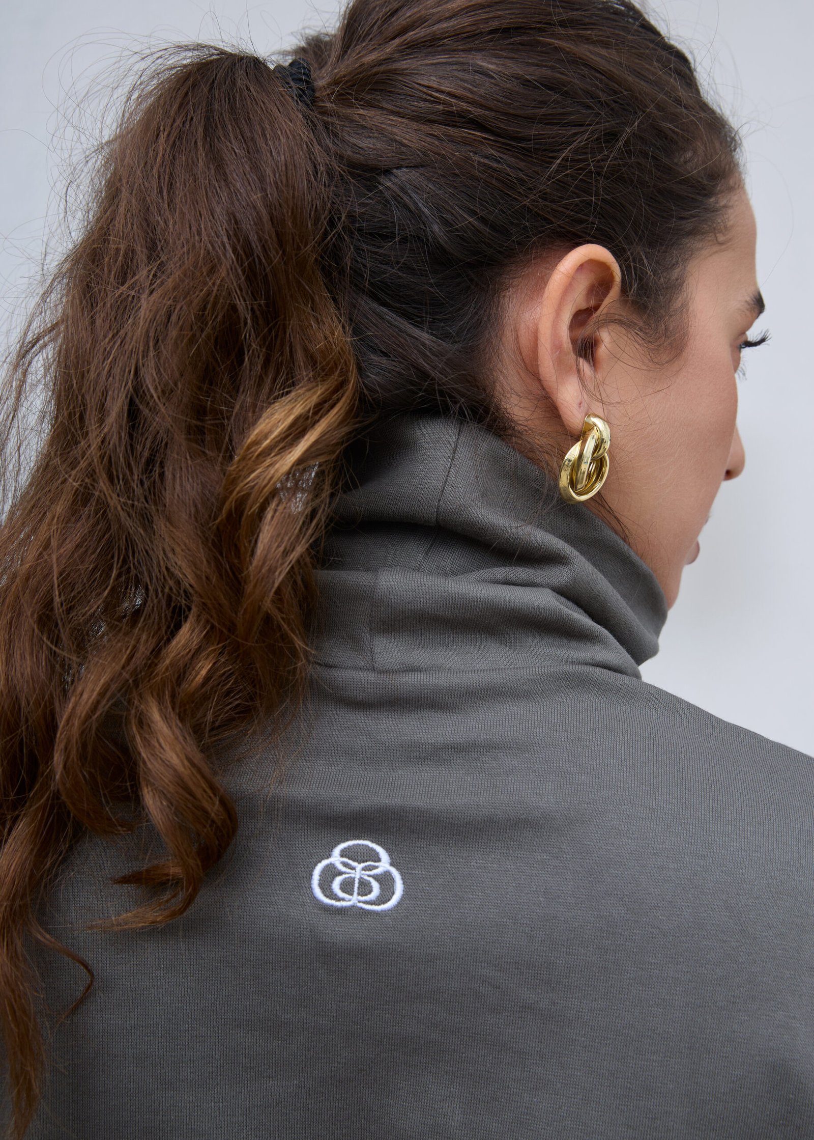 חולצת גולף ארוכה בצבע ירוק זית, עם צווארון גבוה הניתן לקיפול, עבה ונעימה, רקמת לוגו בגב החולצה, משאירה מרווח בין הגוף לבגד.