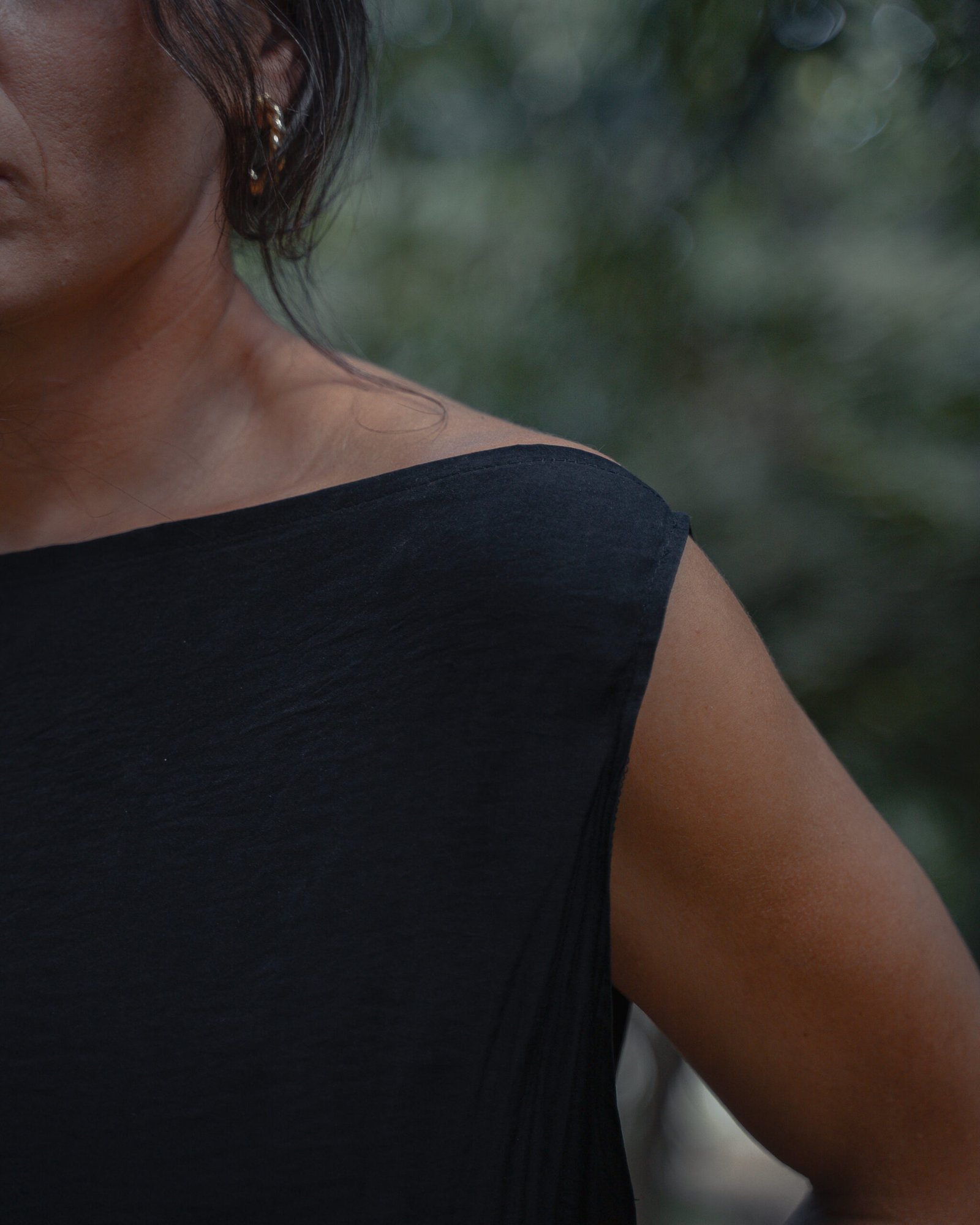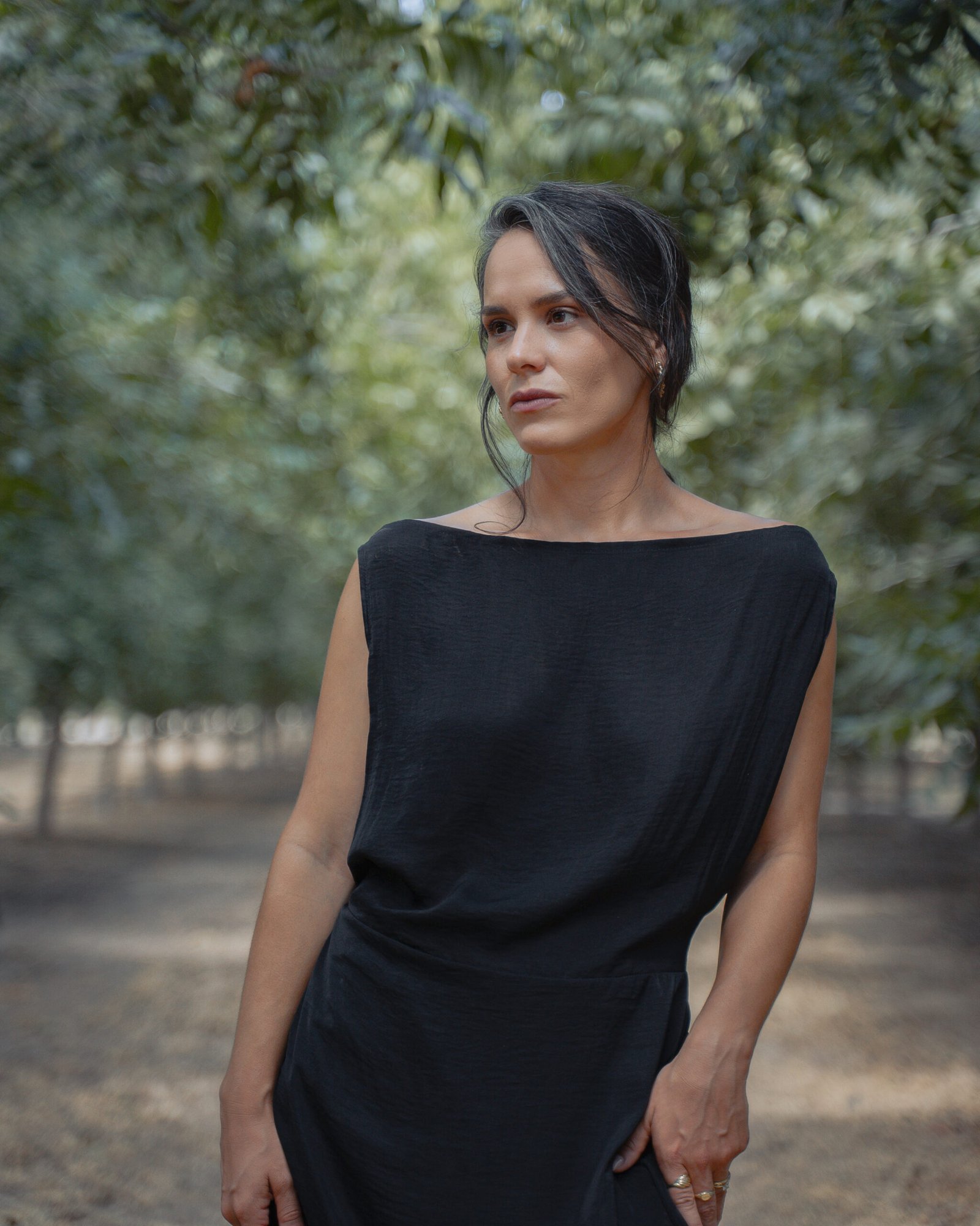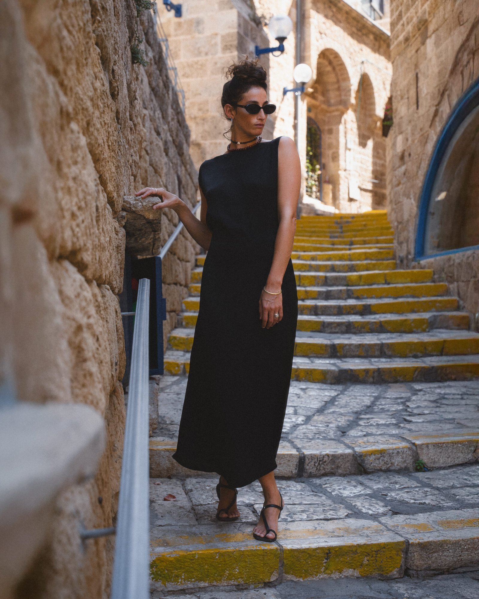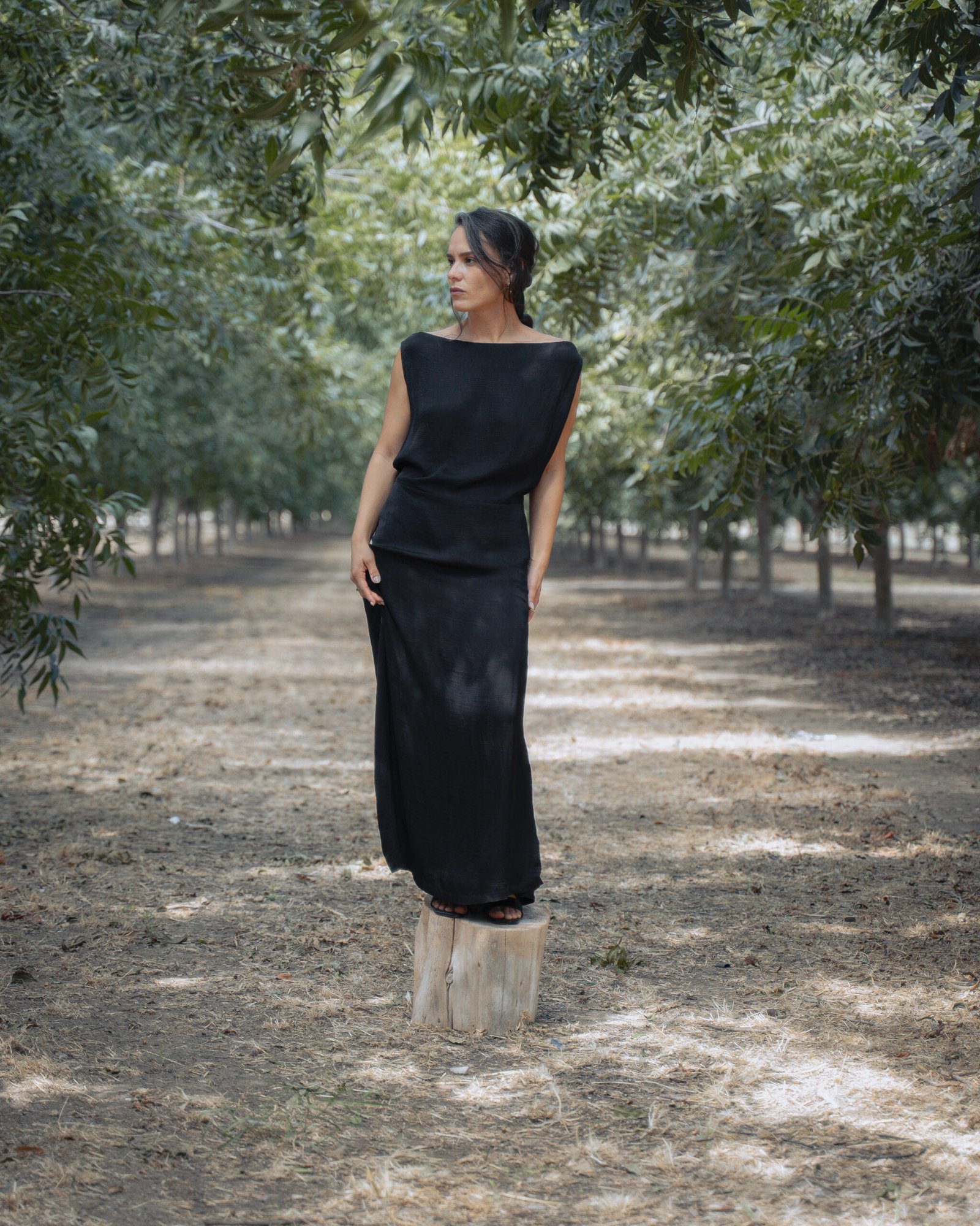 שמלת מקסי, בגזרה קלאסית וישרה, כתפיות בצורת סירה שניתן לשחק עם צורת הנחתן על הגוף בone shoulder, מפתח סירה, או עם בד נשפך מקדימה.