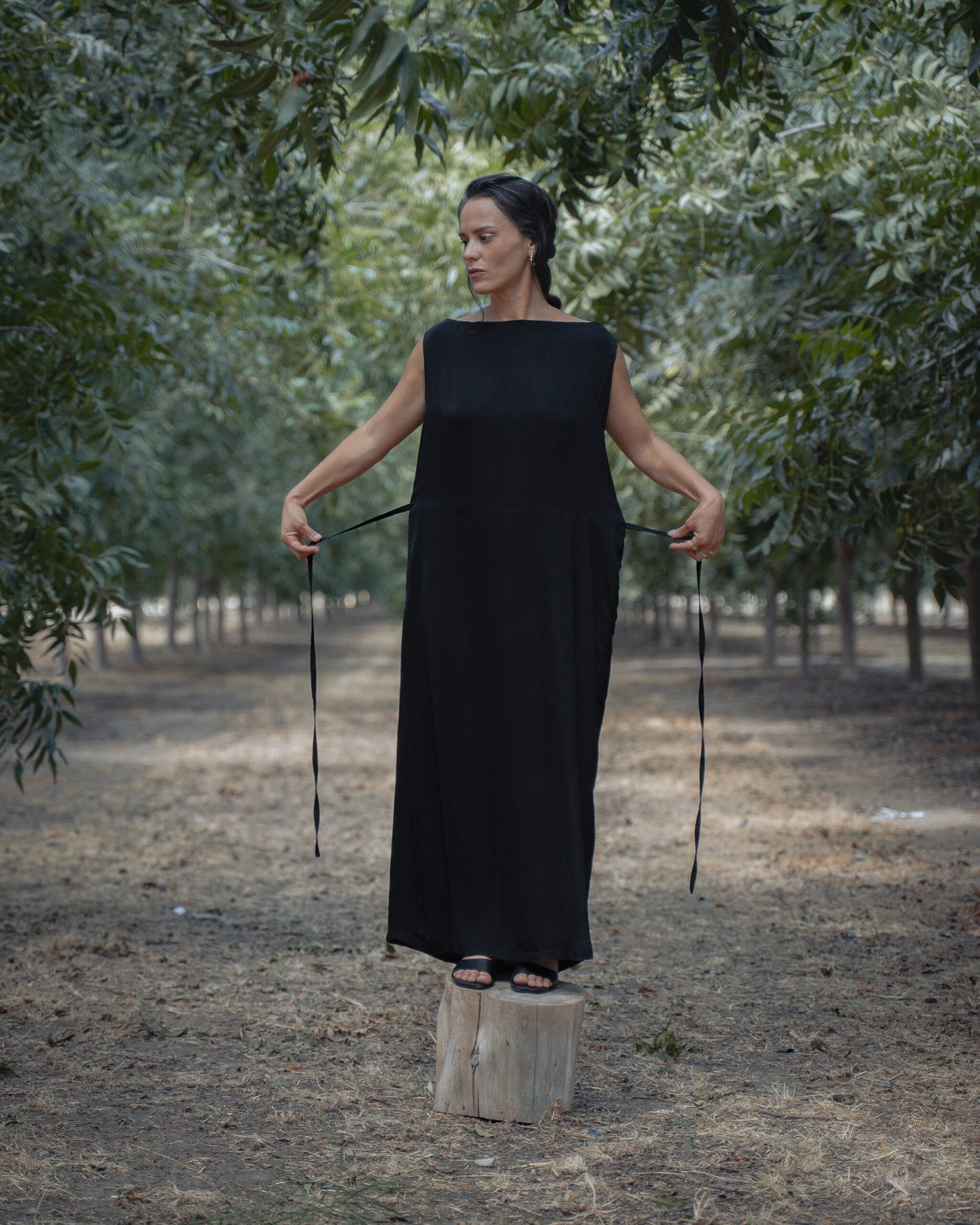 השמלה נשפכת על הגוף בצורה מחמיאה וניתן להתאים אותה בעזרת החוטים בצדדים לגודל המותן.