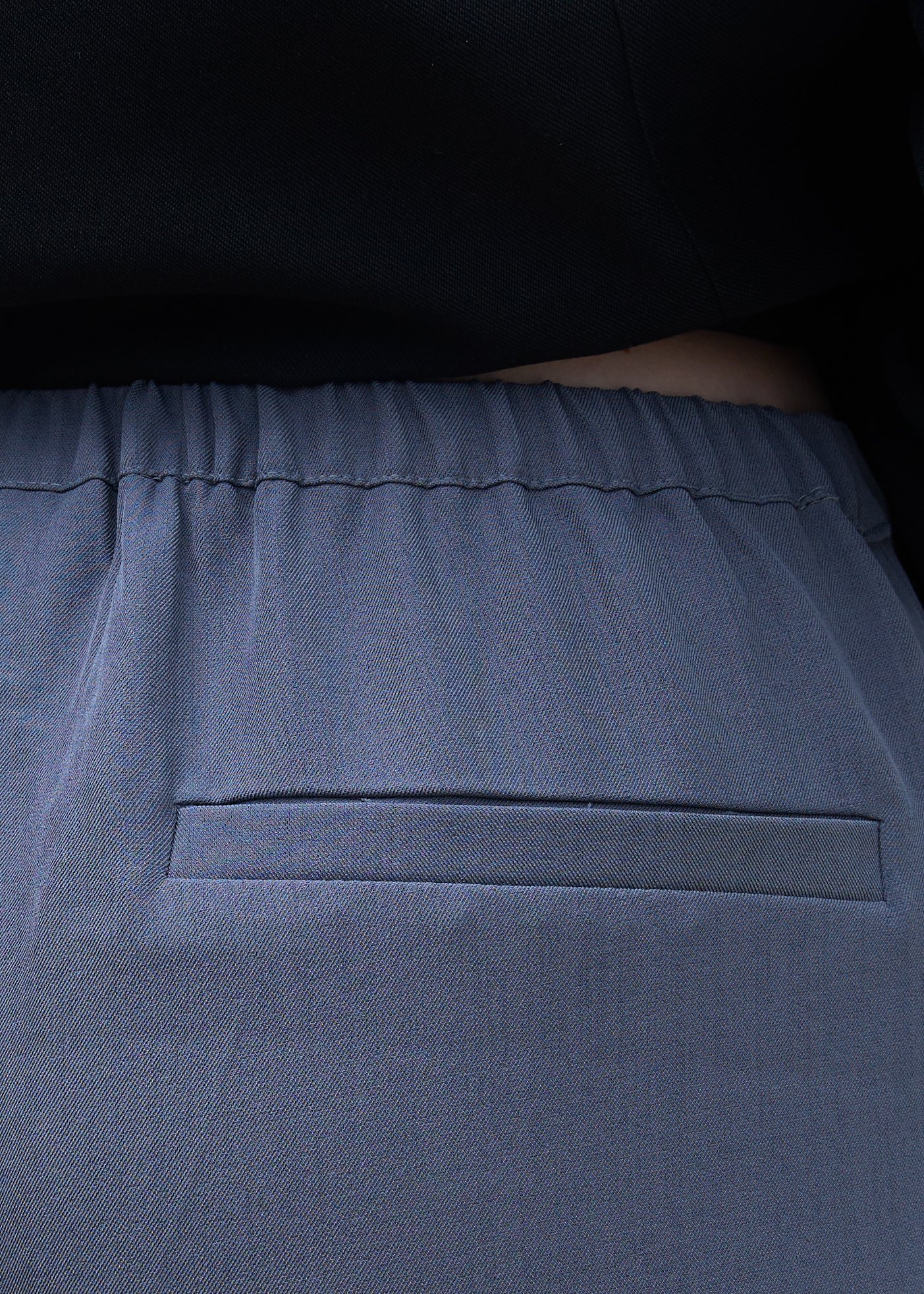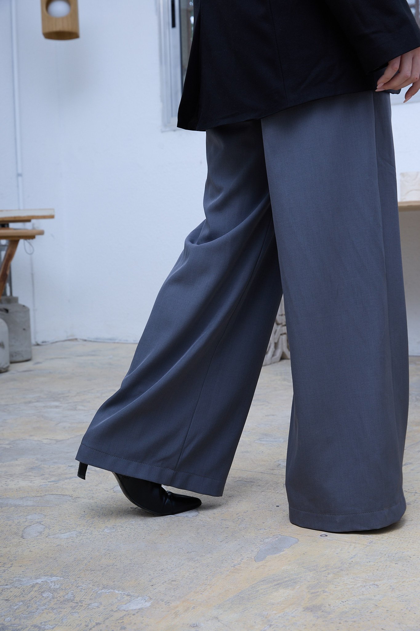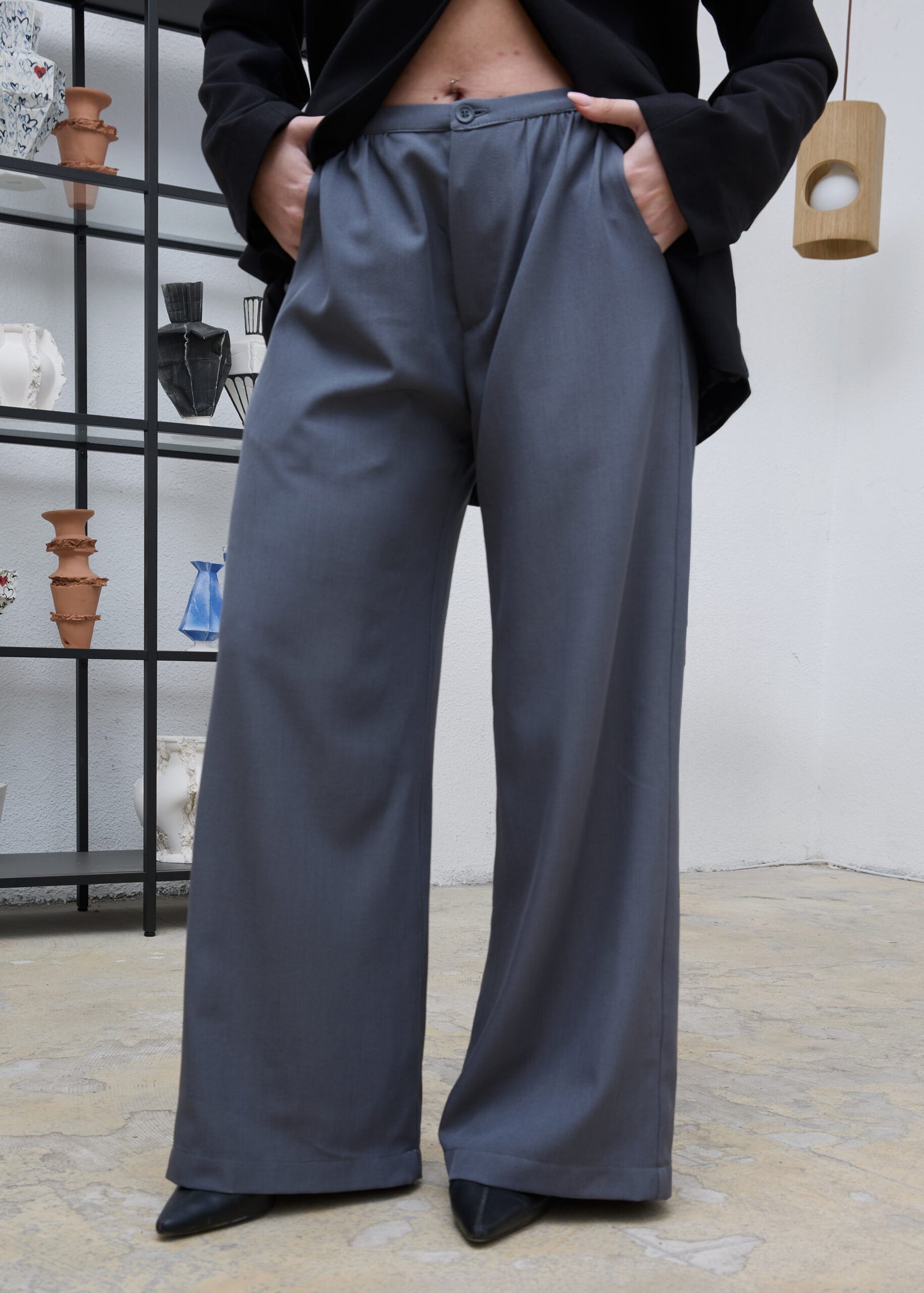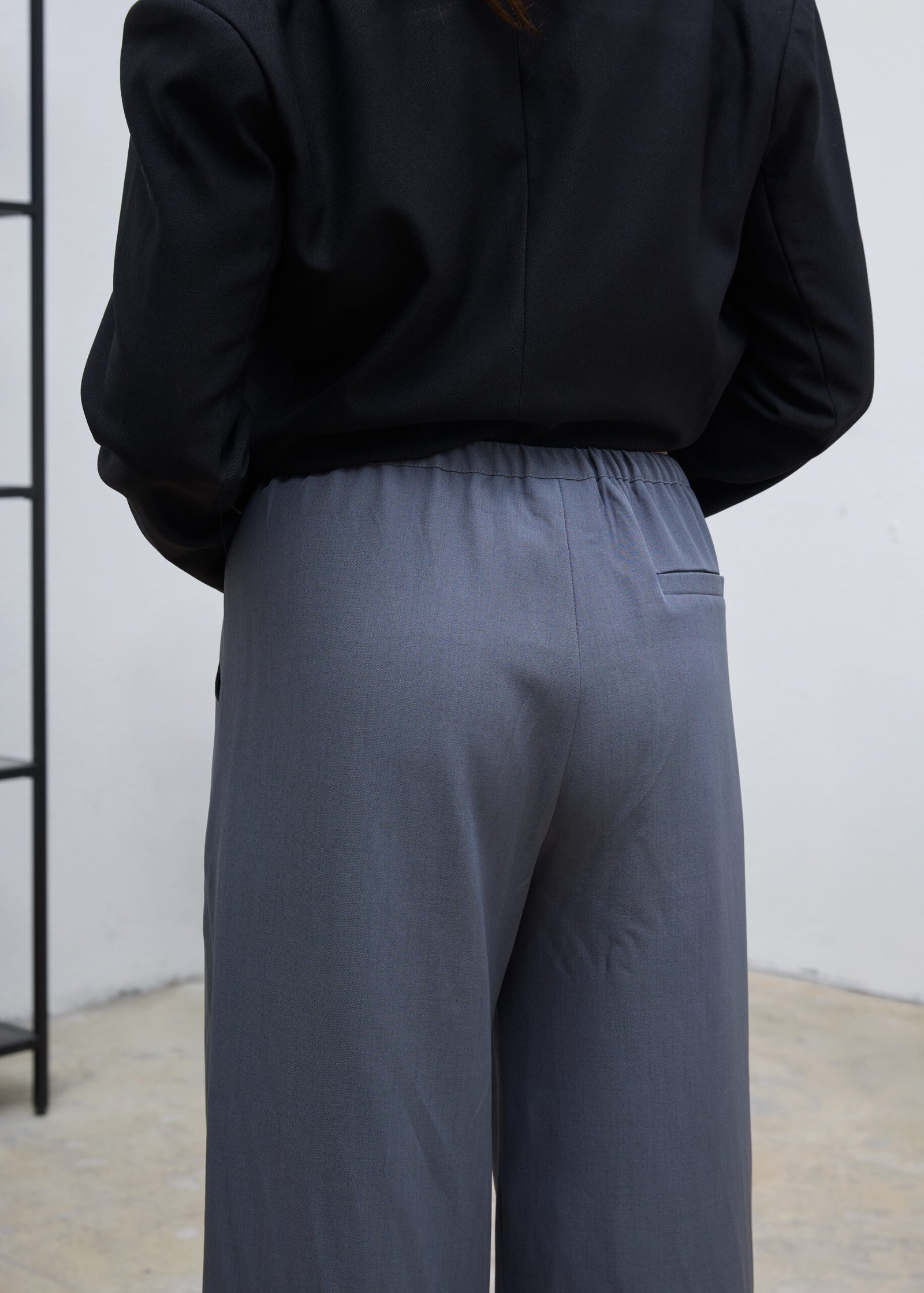 מכנסיים ארוכים מבד נשפך, גמיש ושאינו מתקמט במראה מחויט עם קפלים קדמיים, גובה המותניים משתנה בהתאם להעדפת הלובשת, גומי בחלקו האחורי, כיסים קדמיים ודמויי כיס בחלק האחורי. רקמת לוגו מעל הכיס האחורי בצבע בורדו.