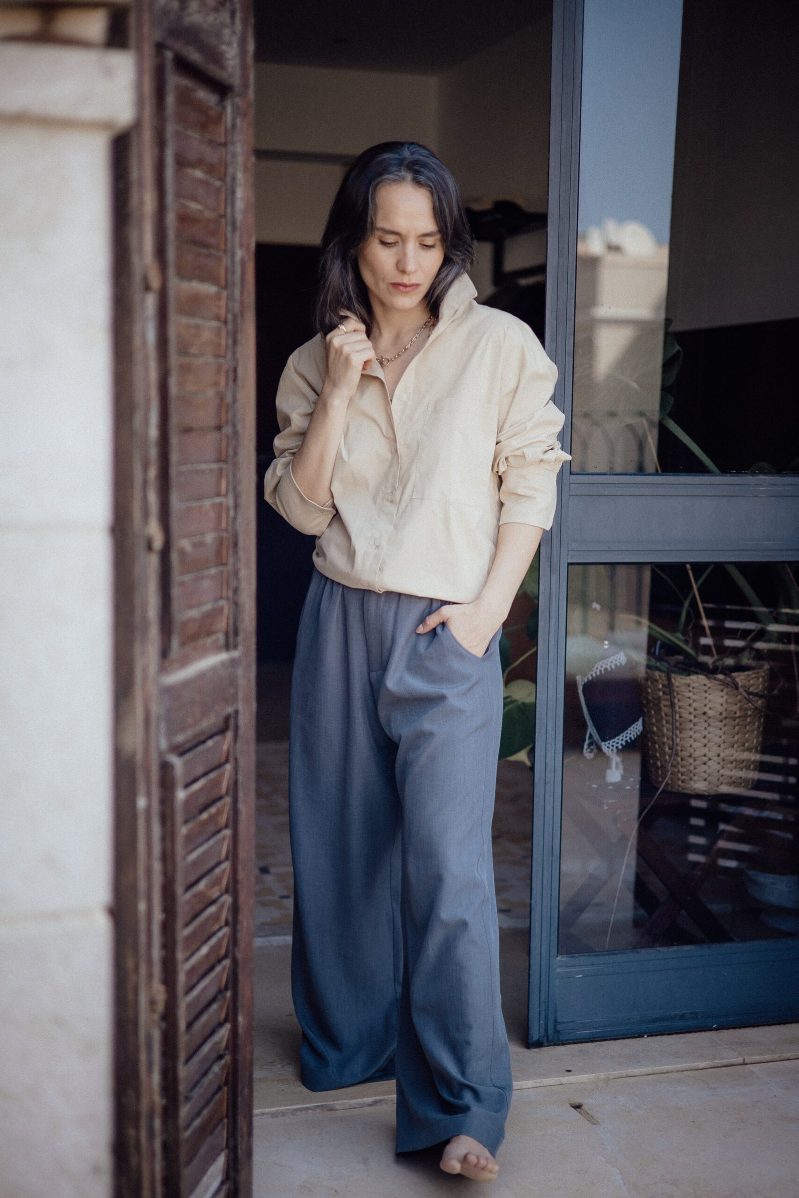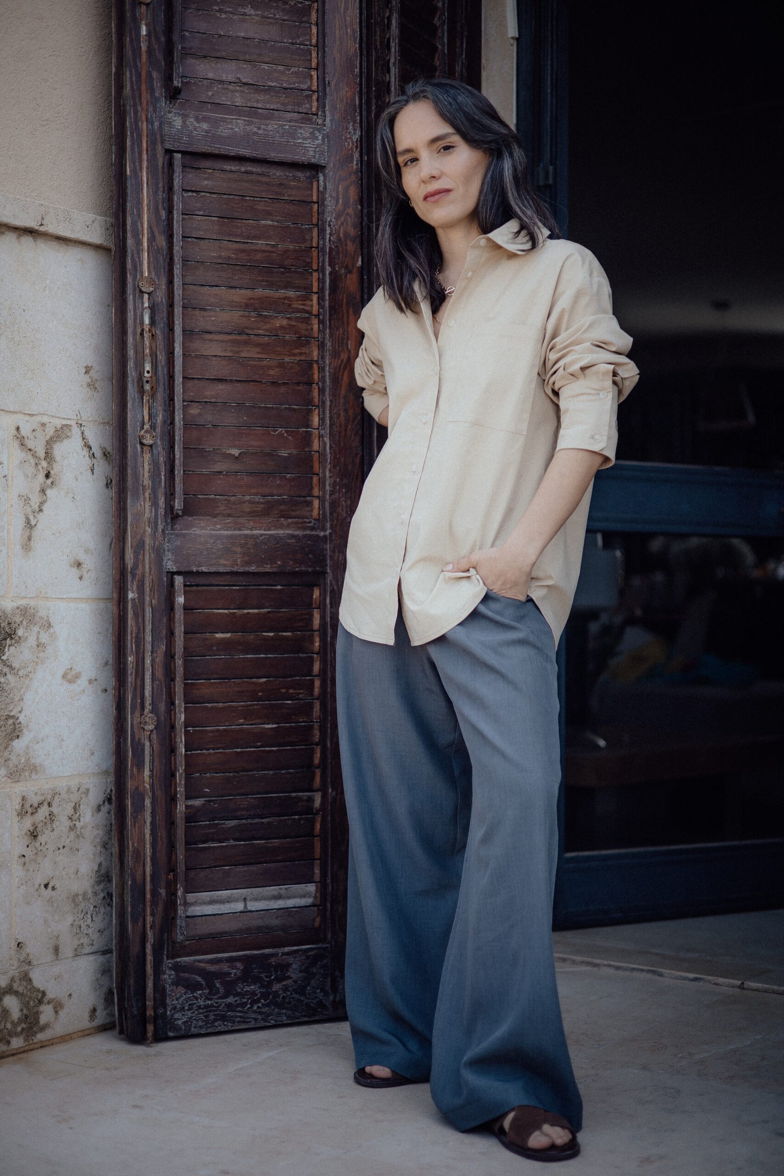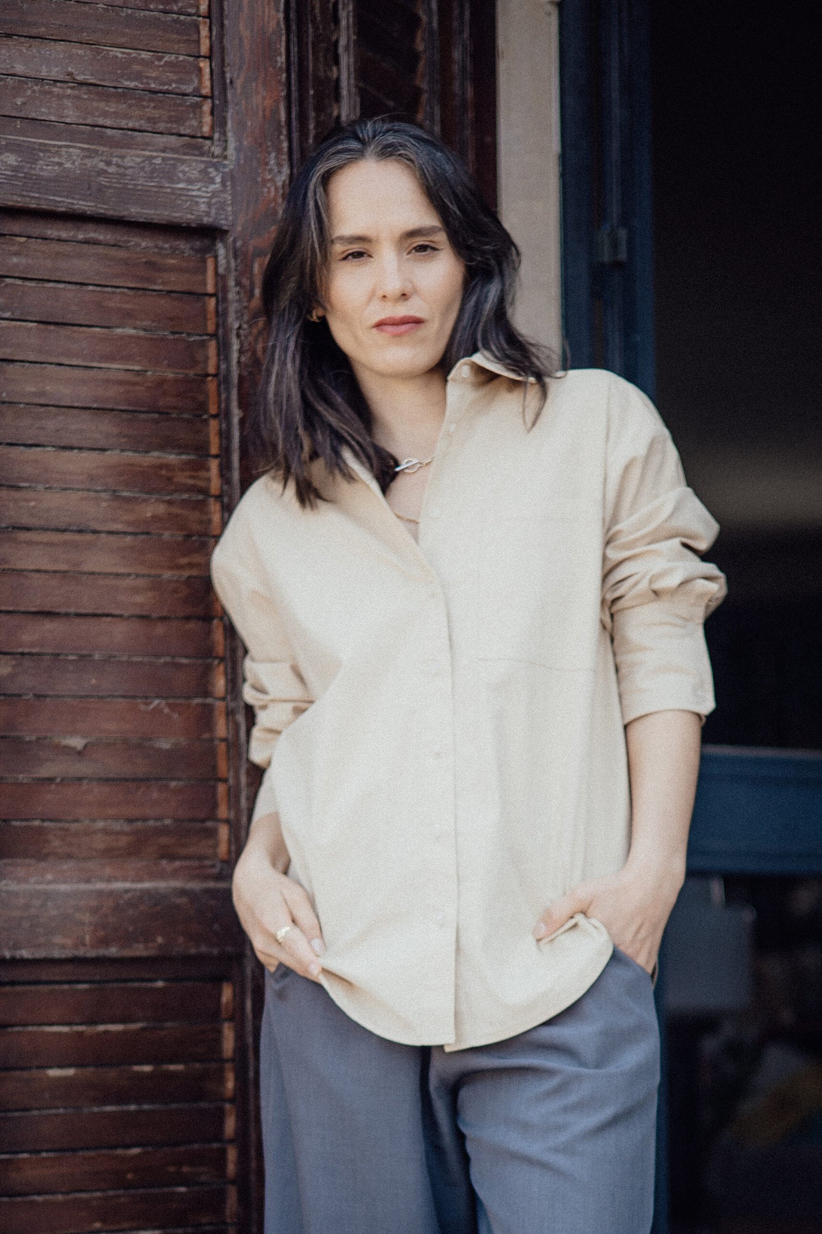 חולצה מכופתרת עם שרוולים ארוכים עשויה מבד כותנה קליל. צווארון קלאסי. כפתורים בצבע חום, גזרה קלאסית עם לוגו רקום על השרוול.